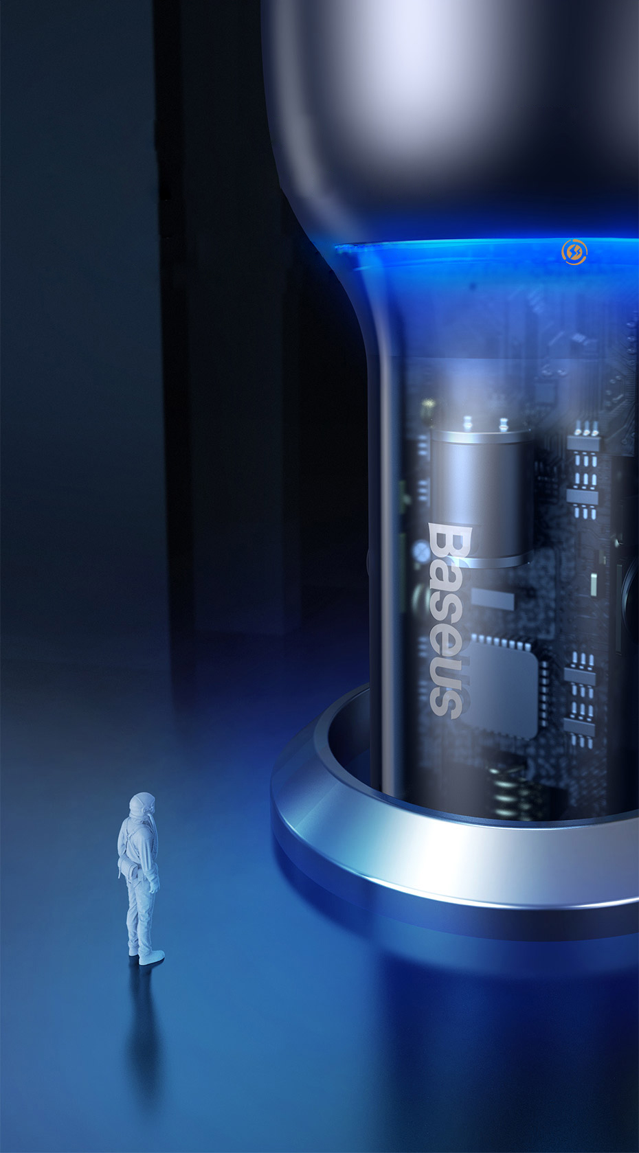 The charger has a transparent shaft and blue backlighting, which exposes its contents, giving the whole device a futuristic look.