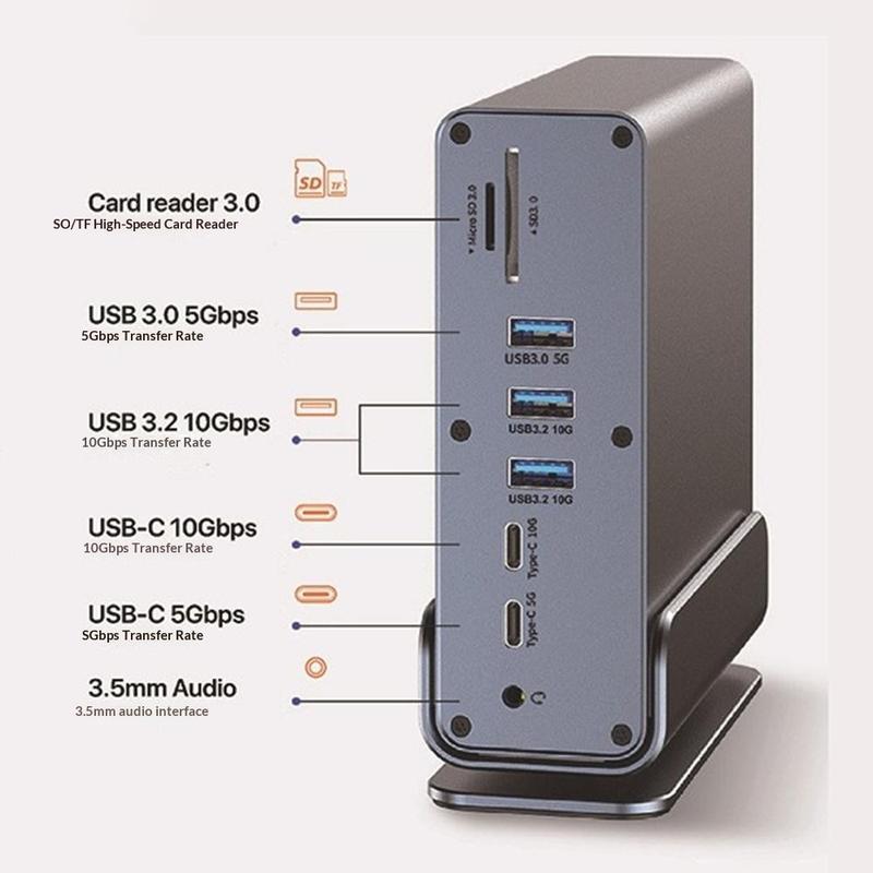 - 15-in-1 expansion: USB ports, triple video, SD/TF card reader, Ethernet, and 3.5mm audio in one hub