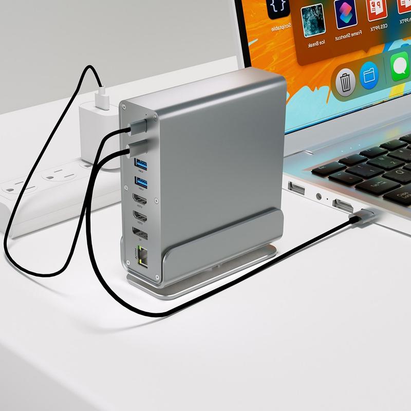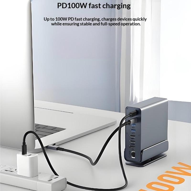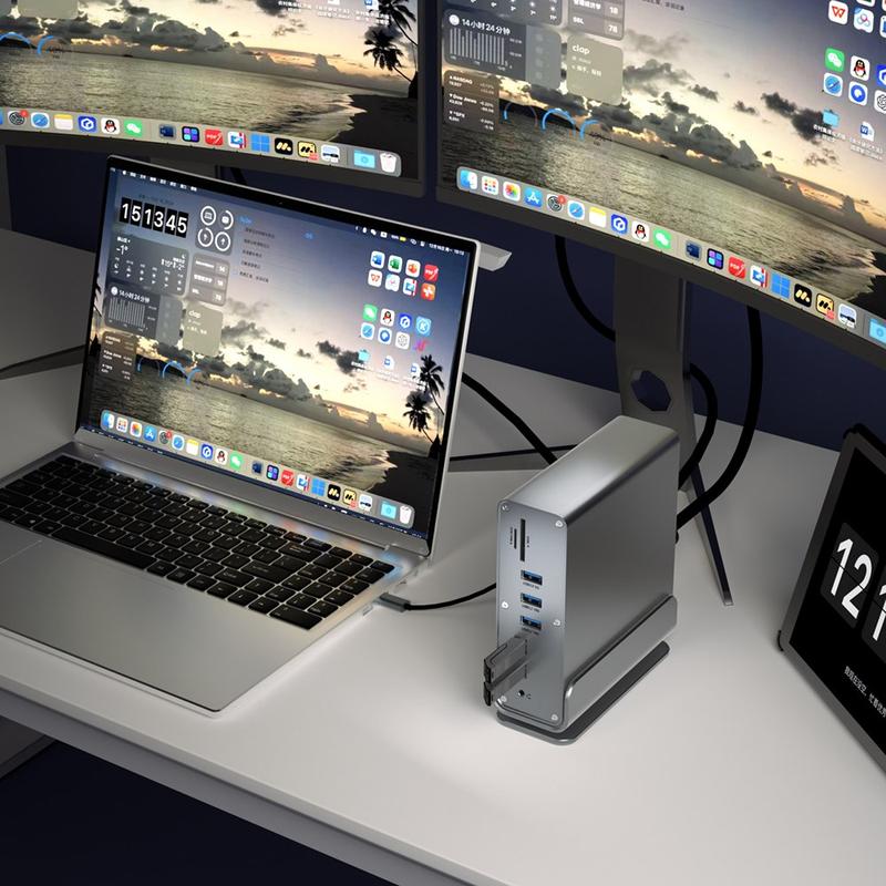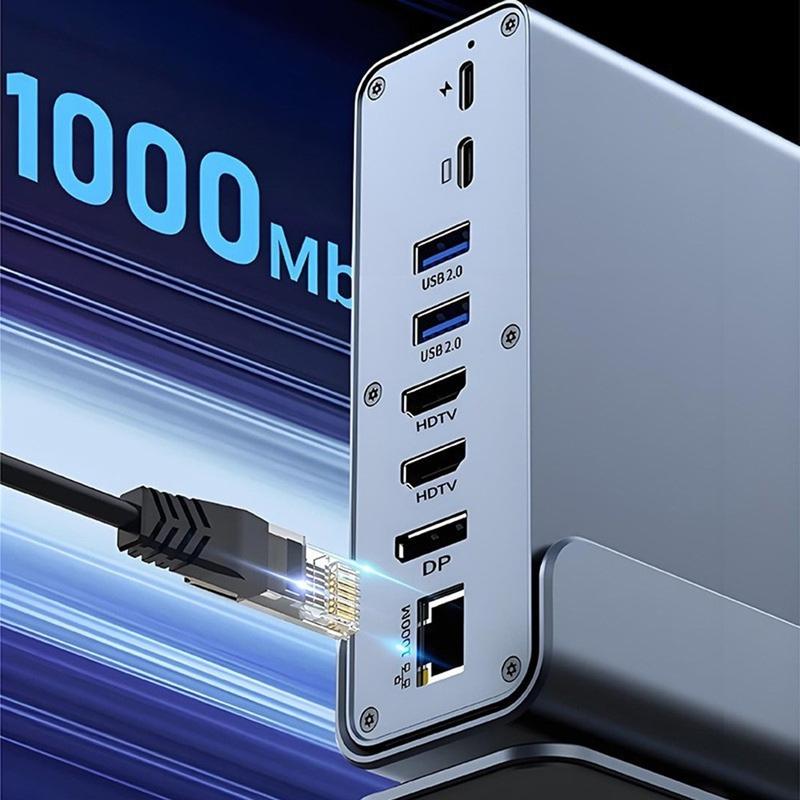 Turn a single USB-C port into a complete workstation with this 15-in-1 USB-C docking station with integrated stand. Built for modern laptops and tablets, it expands your setup with multiple USB ports, triple display outputs, fast wired internet, and card readers-ideal for home offices, creative studios, and productivity-heavy workflows. The all-metal aluminium body looks clean on your desk, helps with heat dissipation, and the built-in stand keeps your device positioned neatly for better ergonomics.