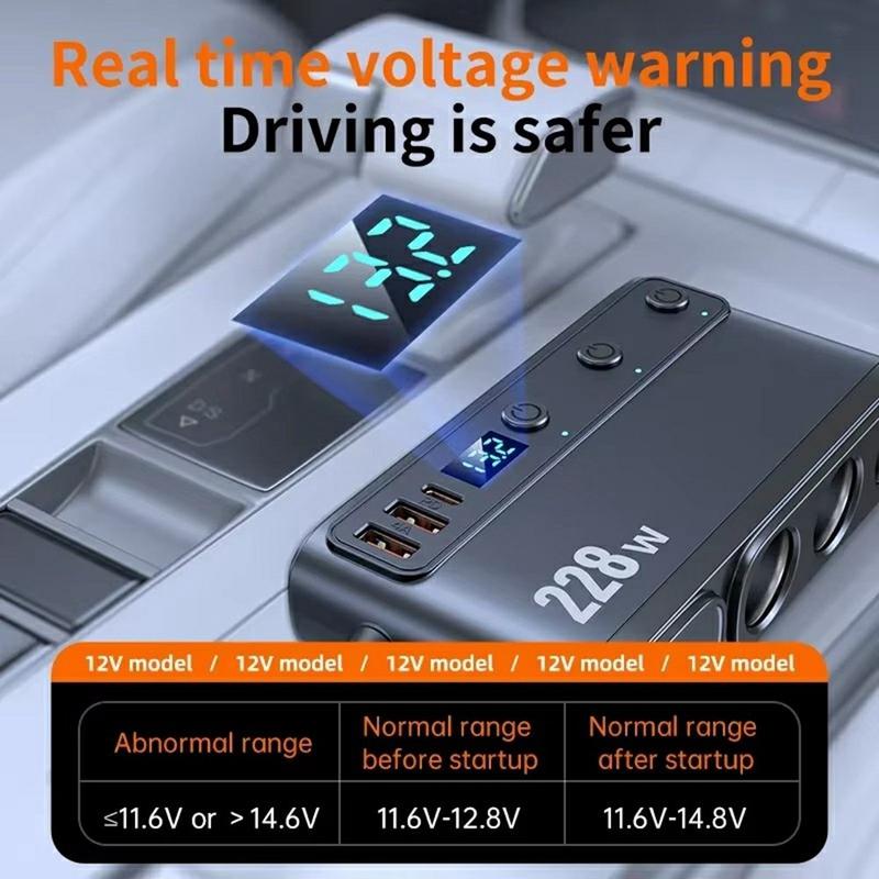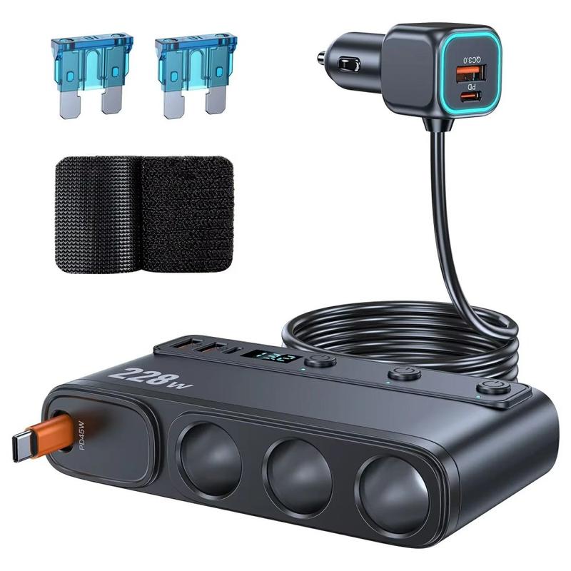 228W 9-in-1 Car Charger with Fast-Charging Cigarette Lighter Splitter with Independent Switches & LED Display - 3x QC3.0 USB-A, 2x PD USB-C, PD USB-C Cable, 3x Cigarette Lighter Socket