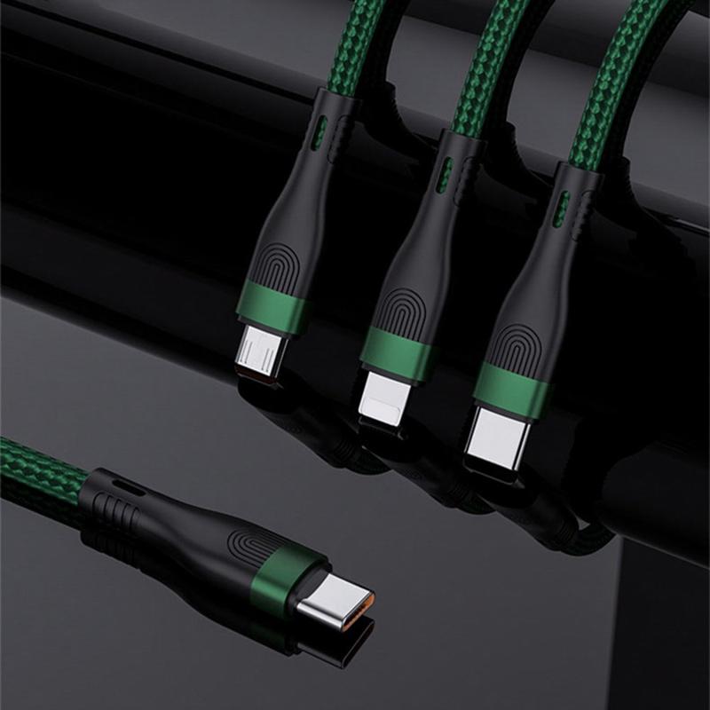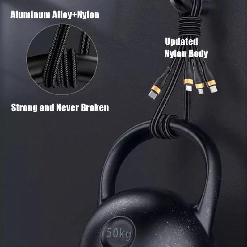 It replaces three separate cables with one tough, nylon-braided 1.2 m lead. The Type-C interface supports up to 5 A PD 100 W fast charge, the E-marker helps manage power safely and efficiently, and the 20,000+ bend rating is built for daily use—excellent value for charging and data with fewer cables to carry.