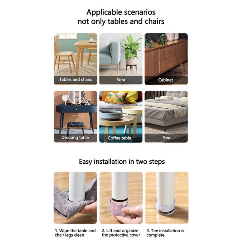 Tired of hearing chairs scraping against the floor or worrying about scratches on your wooden or laminate flooring? These transparent rubber leg caps provide a simple yet effective way to protect your floors, reduce noise, and keep your furniture stable. No need for glue or sticky pads—just slip them onto your chair or table legs, and they stay in place securely.
