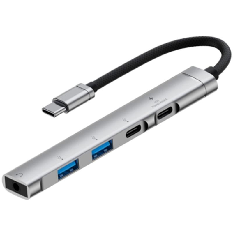 5-in-1 Aluminum Alloy Multifunctional USB-C Hub - 1x Type-C charging port, 1x Type-C data port, 2x USB 2.0, 3.5mm headphone jack