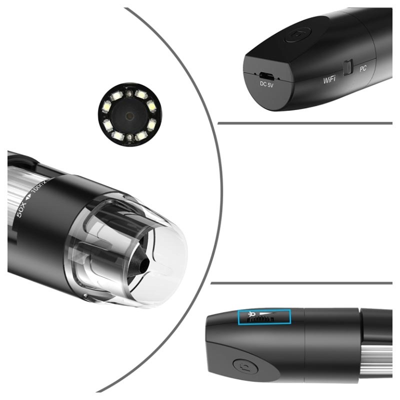 8 podesivih LED svetala pruža optimalno osvetljenje, dok 2MP kamera omogućuje detaljnu analizu 3D predmeta kao što su insekti, kovanice i nakit uz uvećanje u rasponu od 50x do 1000x. Ovaj digitalni mikroskop možete da povežete putem WiFi mreže sa svojim Android ili iOS uređajima, kao i Windows ili Mac kompjuterom. Ukoliko WiFi nije dostupan, možete da upotrebite microUSB kabl da ga povežete sa svojim USB uređajem.