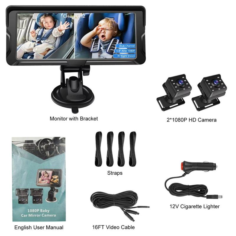 Ensure peace of mind and safer driving with the 6.8-Inch Dual Camera Car Baby Monitor. Designed with two 1080P HD cameras and a wide 6.8-inch display, this system allows you to monitor two children or different rear-seat areas simultaneously. Featuring 360° rotatable cameras, upgraded infrared night vision, and a wide 150° field of view, it delivers reliable coverage day or night. Easy to install and built with durable waterproof housing, this baby monitor is the perfect in-car safety companion for families.