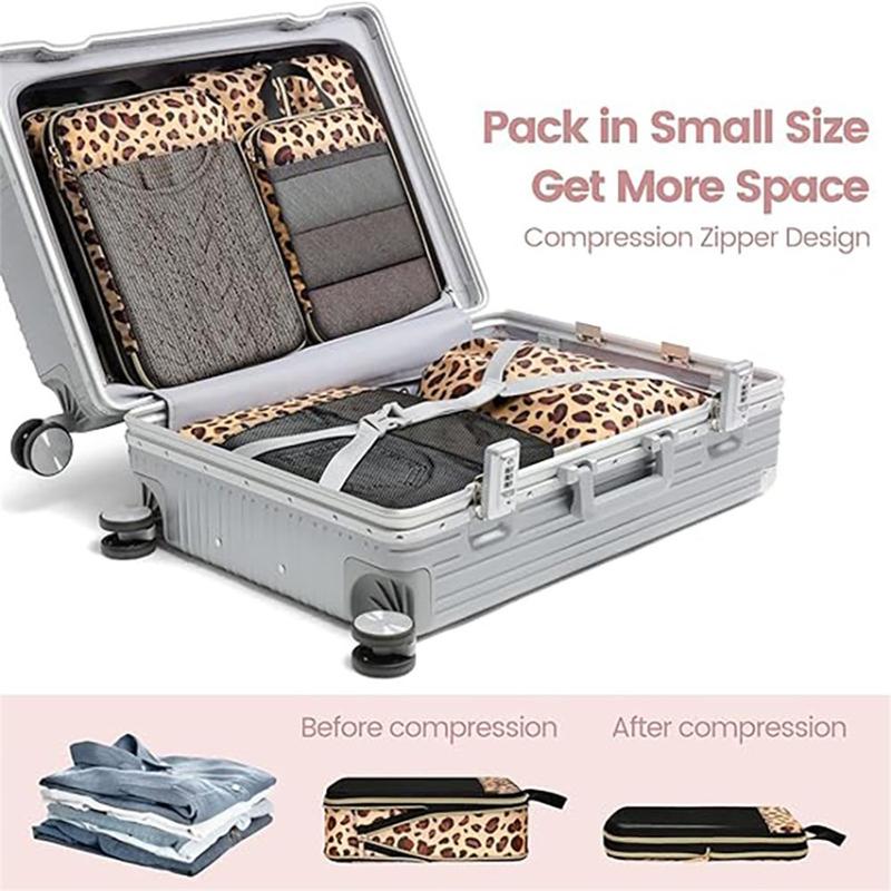 Stay organized in style with the leopard print travel organizer set, a 6-piece compression organizer set that maximizes luggage space while keeping your belongings neatly sorted. Designed for convenience, durability, and elegance, this travel essential makes packing, unpacking, and staying organized effortless wherever you go.