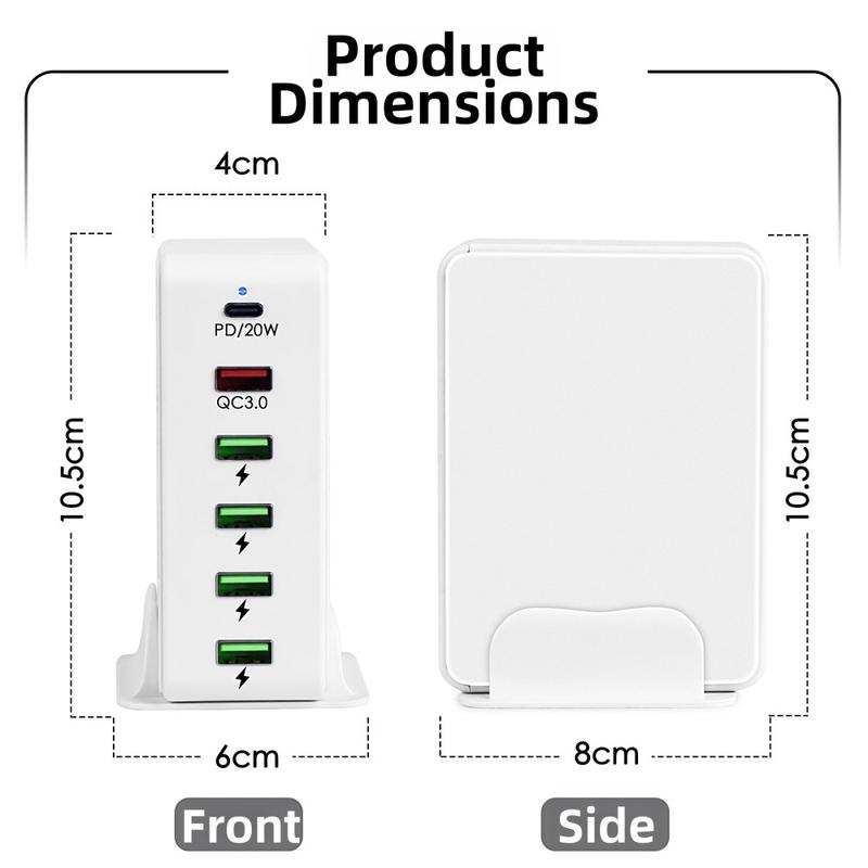 With one PD port, one QC3.0 port, and four additional USB-A outputs, you can charge several devices simultaneously — perfect for workstations, families, or travellers who carry multiple gadgets.