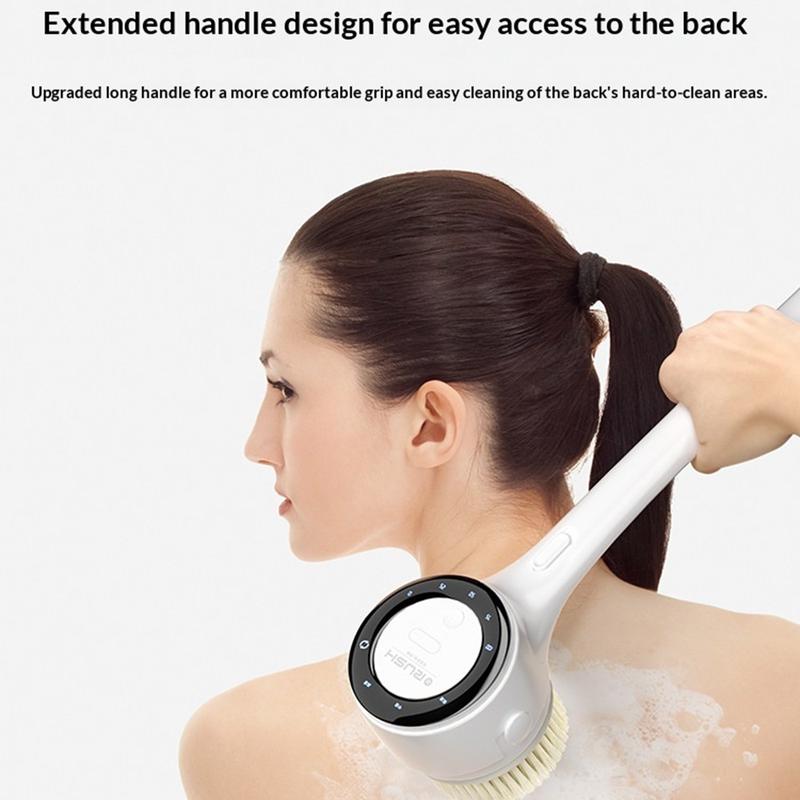 A8 Electric Shower Brush with LED Display - Long Handle 3-Speed Back Scrubber with 5 Brush Heads