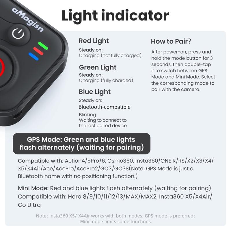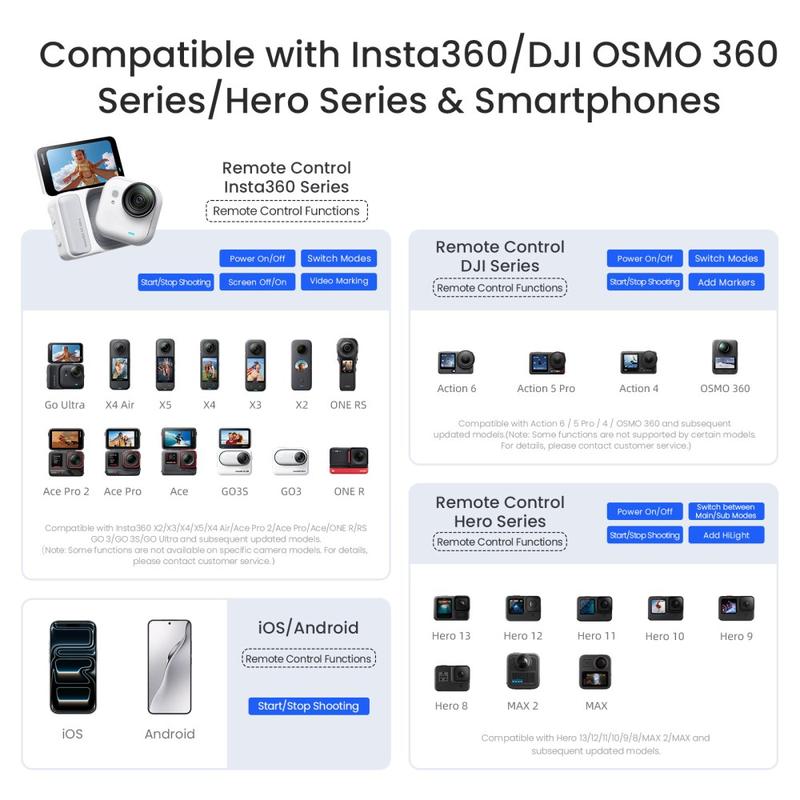 - Wide compatibility - works with iOS and Android smartphones, and supports Insta360, GoPro Hero and DJI action cameras
