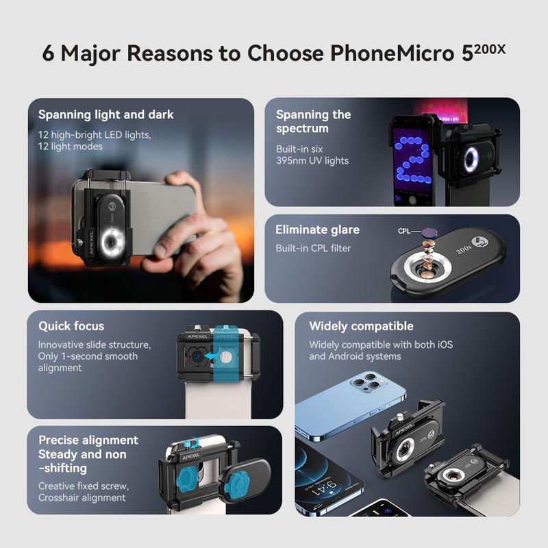 Unlock the microscopic world with the Apexel APL-MS100 Smartphone Microscope, designed to provide 100x high-definition magnification. Perfect for enthusiasts and professionals alike, this portable microscope captures intricate details in jewelry, insects, and other small objects, transferring your smartphone into a powerful observation tool. The built-in CPL filter eliminates glare, ensuring clear and precise images. Versatile lighting options and an innovative quick focus mechanism make this device indispensable for anyone seeking to explore the fine details of the world around them.