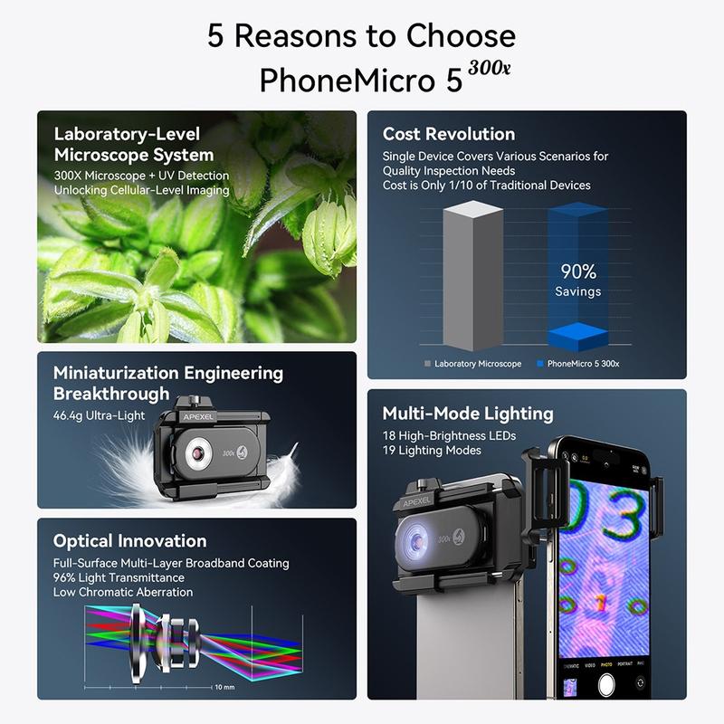 Apexel APL-MS300 300X Microscope Lens for Smartphone - Clip-On Magnifier with Tri-Color LED Lighting & UV Detection