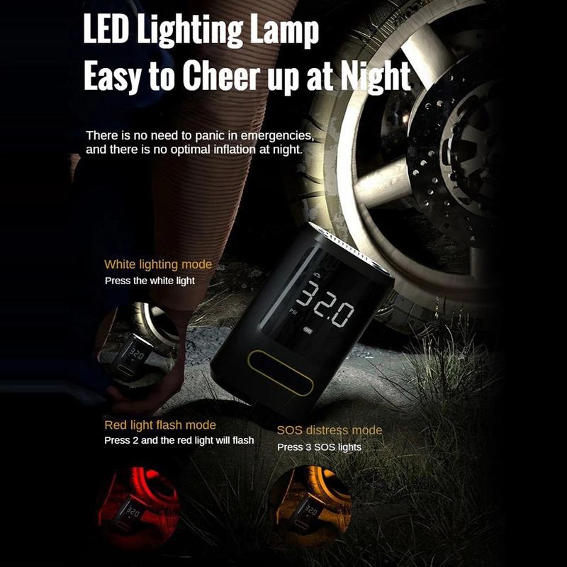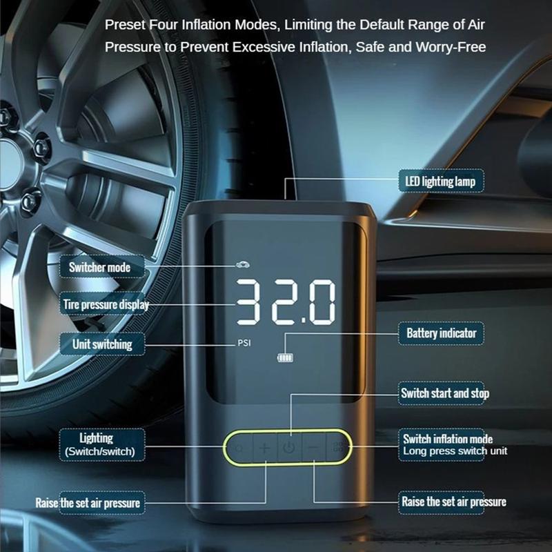 - Four preset modes (car, bike, ball, custom) with auto-stop guard against over-inflation.