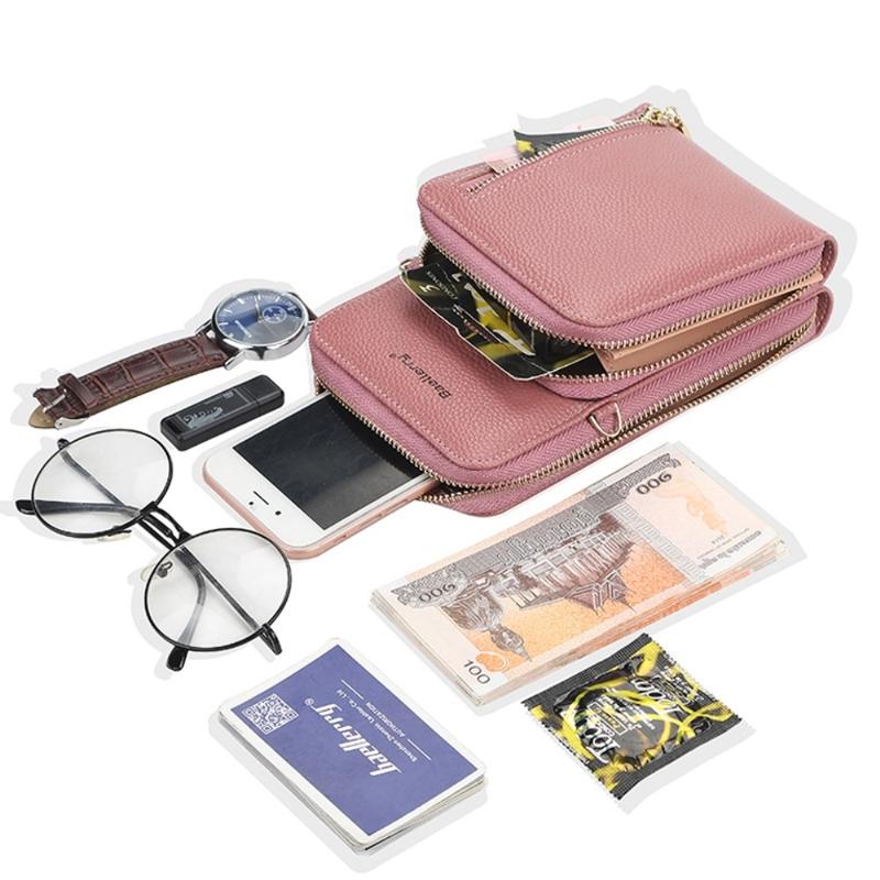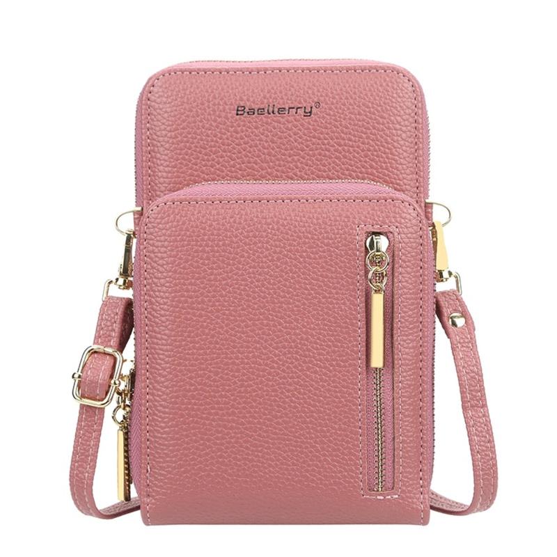 BAELLERRY N0110 Women Double Layer Zipper Wallet PU Leather Cellphone Purse with Shoulder Strap - Deep Pink