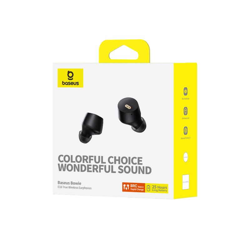 The Baseus Bowie E18 true wireless earphones combine modern design, reliable performance, and everyday comfort. With Bluetooth 5.3 technology, they deliver a fast, stable connection to smartphones, tablets, laptops, and more. Each charge provides up to 7.5 hours of continuous playback, and with the charging case, total listening time extends to 25 hours. Fast charging ensures up to 2 hours of music with just 10 minutes of charging. Built-in ENC noise reduction enhances call quality by filtering background noise, while the IPX4 waterproof rating protects against sweat and light rain. Compact and lightweight, the Bowie E18 earbuds are the perfect choice for music, movies, workouts, and calls.