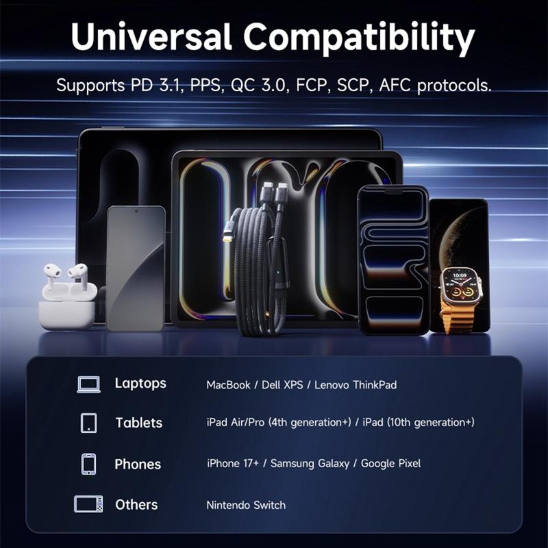 - Supports major fast-charging standards including PD 3.1, PPS, QC 3.0, FCP, SCP, and AFC