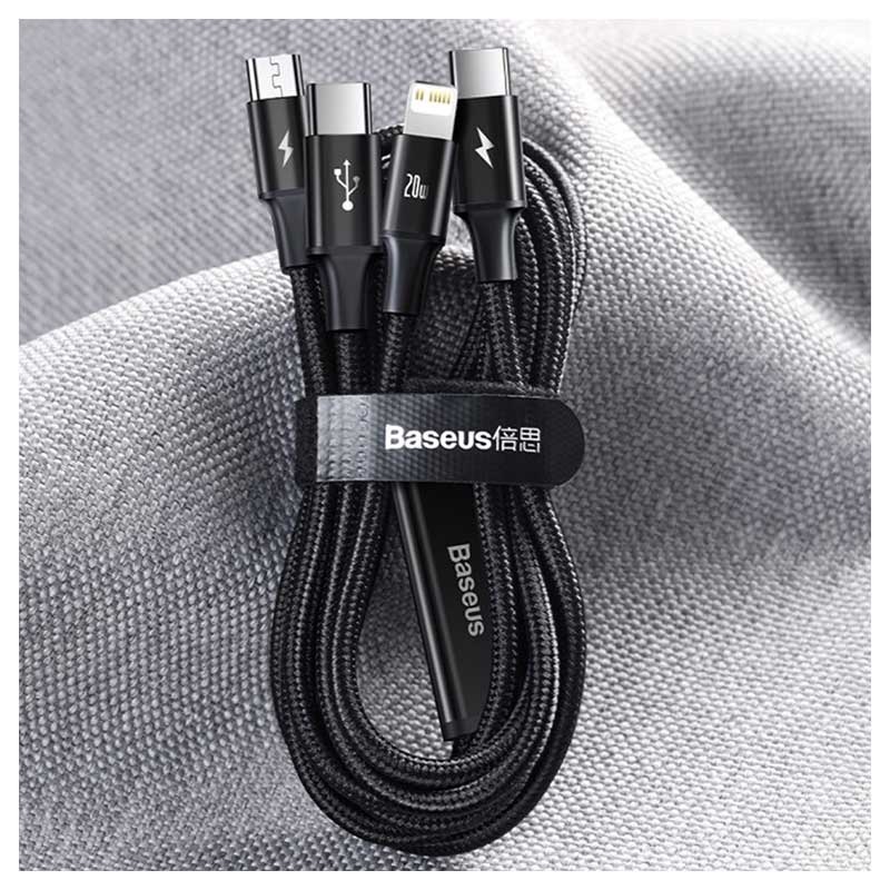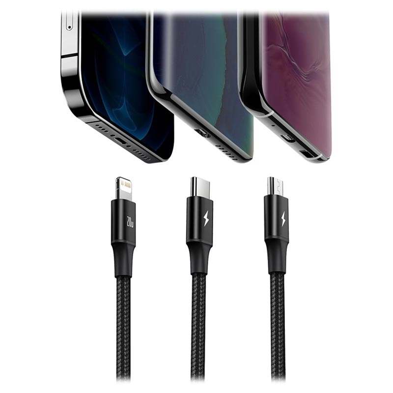 Baseus brzi 3-u-1 USB-C kabl obezbeđuje tri različita ulaza za brzo punjenje više uređaja preko samo jednog priključka za napajanje. Ovaj 1,5m dug kabl sa USB-C, MikroUSB, i Lightning priključkom podržava Power Delivery 20W tehnologiju brzog punjenja i prenos podataka brzinom od 480Mb/s. Napravljen je od kvalitetnog upletenog najlona sa priključcima od legure aluminijuma izuzetne čistoće, koji mogu da izdrže uvrtanje i savijanje.