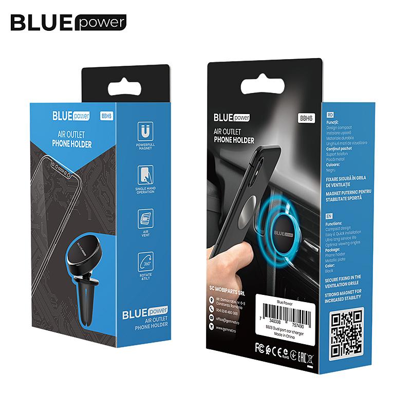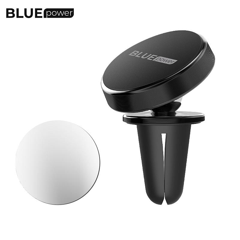 The Blue Power BBH6 Universal Magnetic Car Holder is the perfect solution for safely and securely mounting your phone in your car. With an easy installation process, this car holder is designed to attach to the car's vents and can be used effortlessly. The grip is made of rubber to ensure that it does not damage the vents, providing a secure base for your phone. Two metal plates are also included, which can be attached to the phone case or directly to the phone with adhesive. This allows the phone to be magnetically attached to the holder with a firm grip, giving you the ability to orient the phone in either portrait or landscape mode. Despite its strong grip, the holder is small and discreet, seamlessly integrating into even the most modern cars.