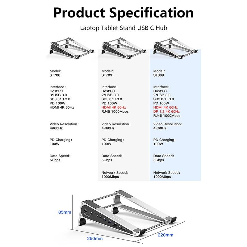 With support for 4K@60Hz video output and 100W Power Delivery pass-through charging, the ST708 keeps your laptop powered while extending your display to an external monitor. The aluminum alloy structure with stainless steel support tubes provides stability and durability, making it suitable for home offices, creative workstations, and travel setups.