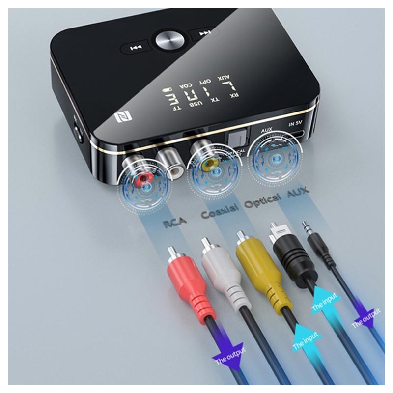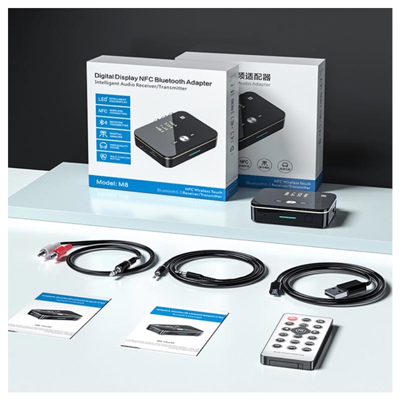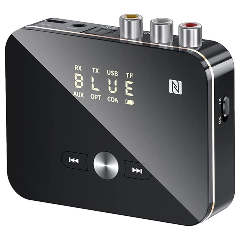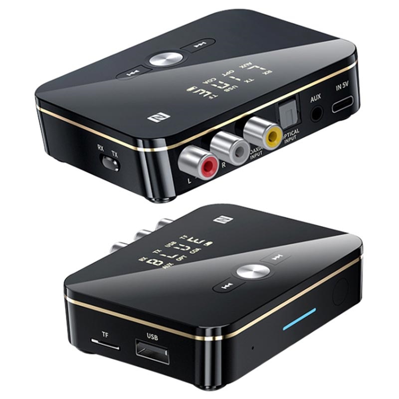 Use the M8 Bluetooth 5.0 audio transmitter / receiver to conveniently connect your smartphone, laptop, TV, or projector with your wireless speakers or headphones. It features 3,5mm AUX, RCA, coaxial, optical fiber, USB port, slot for TF card for ultra-wide compatibility, while its NFC support allows pairing with your smartphone or tablet in just two seconds. This 2-in-1 Bluetooth transmitter / receiver has an LED digital display that shows the working status and selected Bluetooth mode (transmitter - TX, or receiver - RX). Upon that, it comes with an infrared remote control with an operating range of up to 8 meters for more practical management.