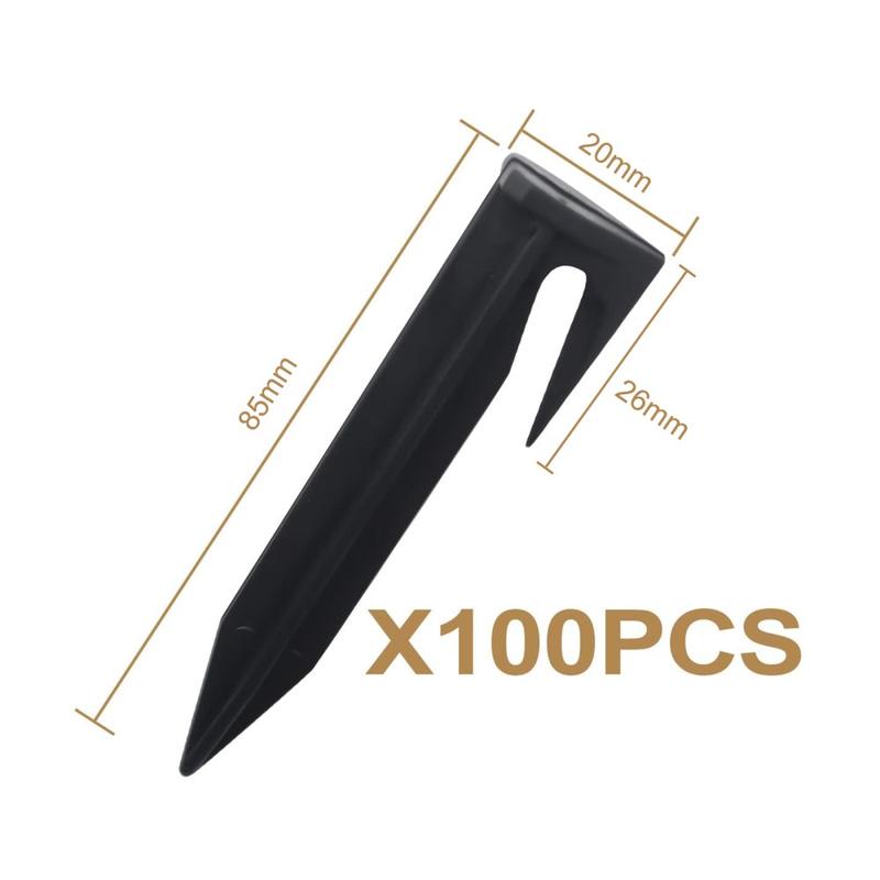 Secure your garden installations with this set of 100 plastic ground staples, each measuring 8.5 cm. Designed for anchoring boundary wires, landscape edging, and various yard applications, these durable pegs ensure stability and longevity for your outdoor projects.