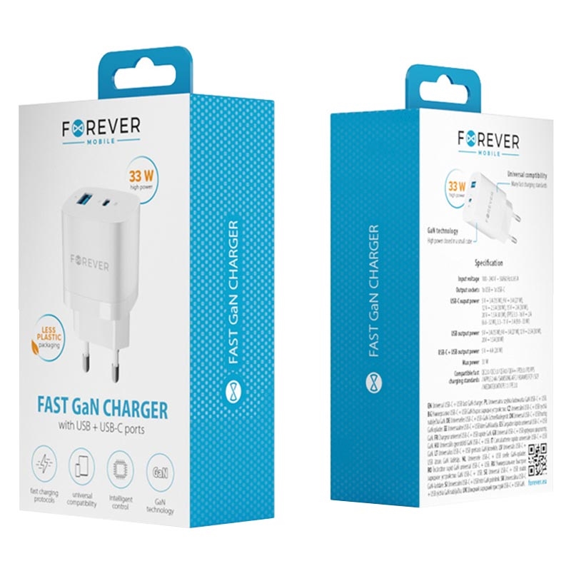 Forever GaN TC-05 Brzi Zidni Punjač – USB Quick Charge, USB-C Power Delivery, 33W, EU-utikač