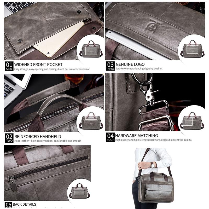 The BULLCAPTAIN 046 men’s leather briefcase is designed for professionals who need a reliable and stylish way to carry their work essentials. Crafted from premium top-layer cowhide leather, it offers a refined appearance combined with durability for everyday use. The smart pocket layout provides quick access to frequently used items while keeping valuables secure. With multiple carrying options, this bag adapts easily to office life, meetings, and business travel.