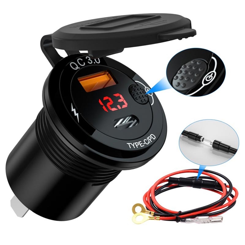 Upon delivering safe and efficient charging for your mobile devices, this model also displays the car's battery voltage in real-time and has a switch that lets you turn it off when you don't need it. You can install it instead of the 12V/24V socket in your vehicle or drill a new 29mm hole and connect it to the electrical system using the included wires with an integrated 20A fuse.