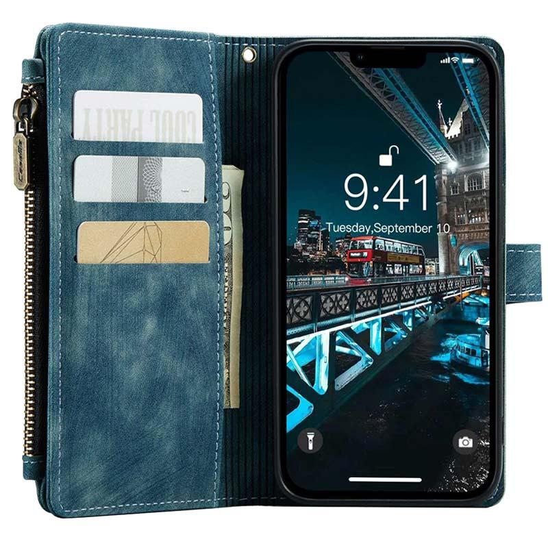 This multifunctional wallet case for iPhone 14 Plus will leave you speechless! Designed with ten card slots, one cash slot, and one zipper pocket - enough to carry your essentials everywhere you go! It's made of a quality polyurethane and inner TPU material, secured with magnetic closure. Also, it comes with a hand strap for more effortless wearing, and it can be used as a kickstand for enjoying watching videos hands-free.