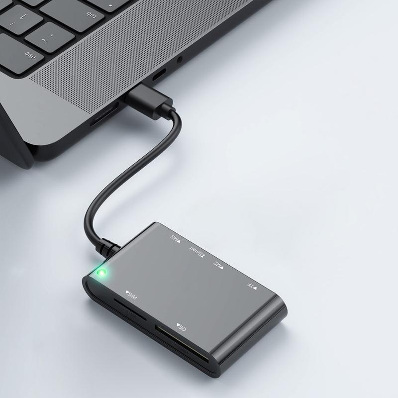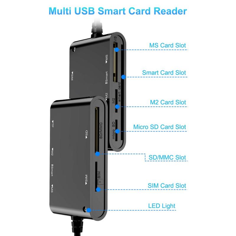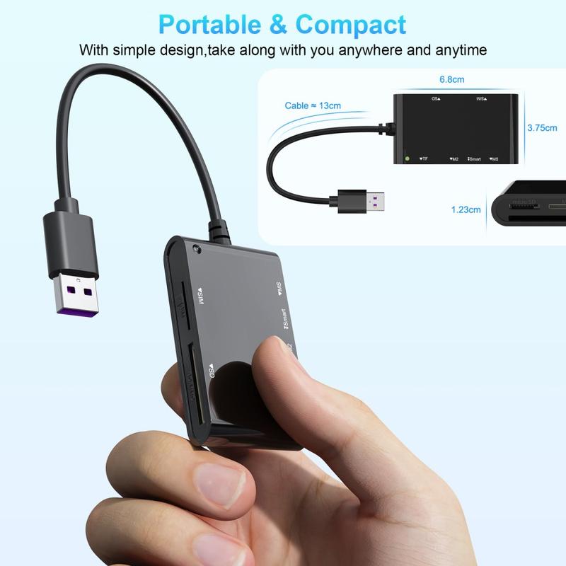 - 6-in-1 Card Reader – Supports Smart, MS, M2, TF, SIM, and SD cards for broad usability.