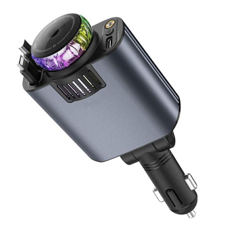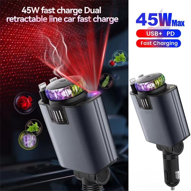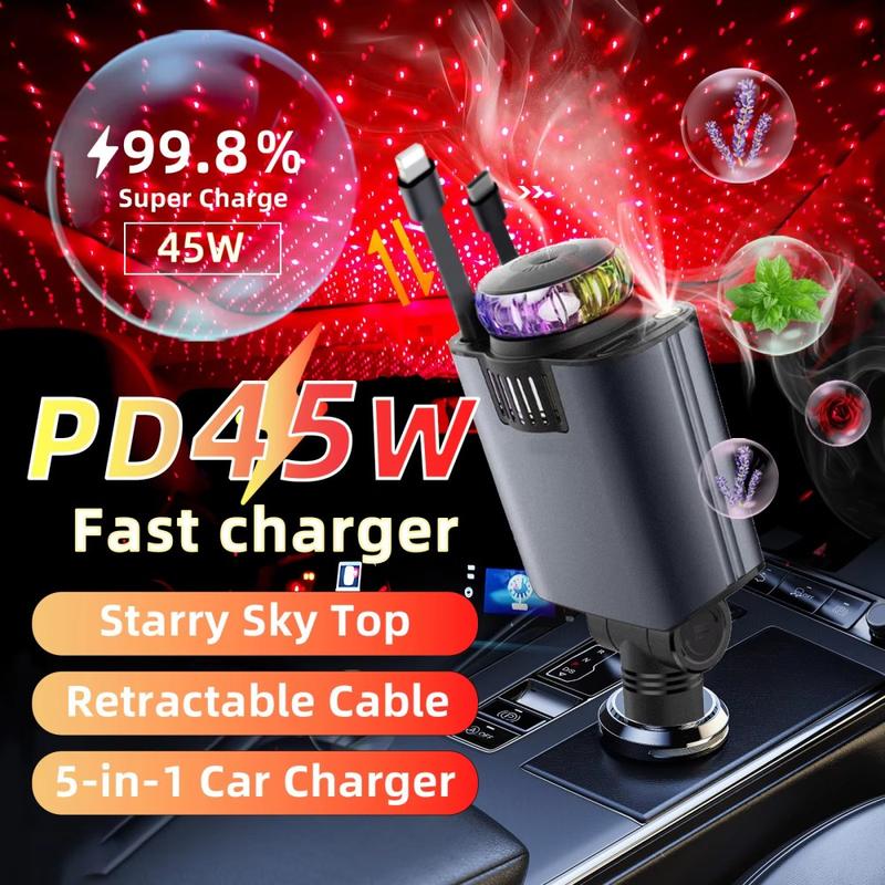 D1 5-in-1 45W PD & QC Car Charger with Star-Light Projector, Aromatherapy Diffuser & Retractable USB-C / Lightning Cables