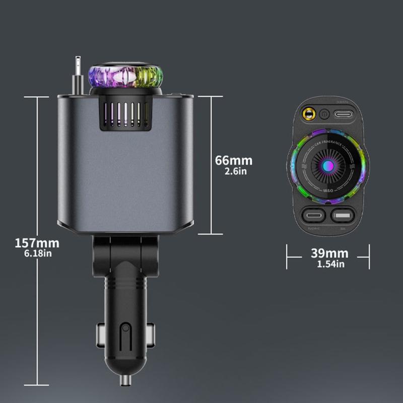 - 5-in-1 versatility – fast charger, magnetic star-light projector, waterless aromatherapy diffuser, dual retractable cables and battery-health voltmeter in one compact device.