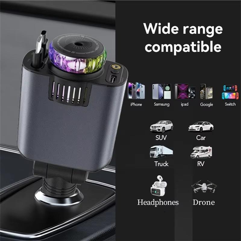 Transform every journey into a rapid-charge, spa-like experience. The D1 car charger slips into any 12 – 24 V socket and delivers up to 45W of Power Delivery / Quick-Charge power while bathing the cabin in a relaxing essential-oil mist and a mesmerising red-light star sky. Twin 80 cm retractable cables (USB-C + Lightning) snap back at a button press, keeping dashboards tangle-free, and a bright voltage display lets you monitor battery health at a glance.
