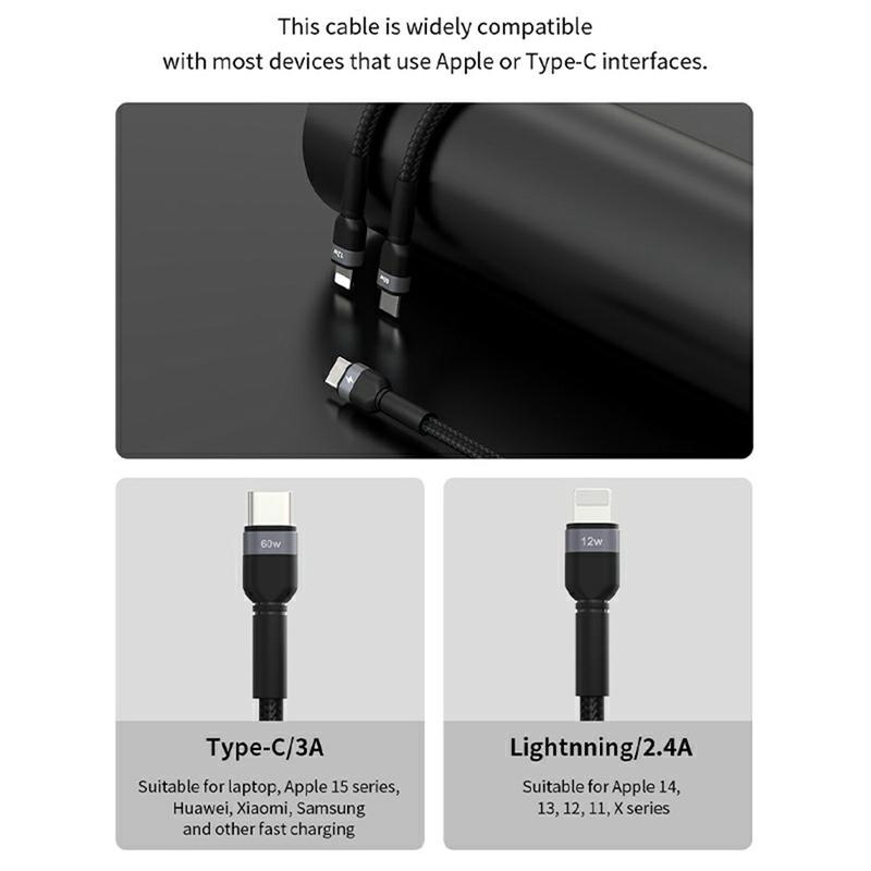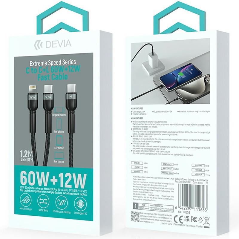 Simplify charging for mixed-device households with the Devia EC648 Extreme Speed Series dual-connector cable. This one-to-two design combines USB-C fast charging for modern phones, tablets, and laptops with a Lightning connector for older iPhone models, so you can carry one cable instead of several. Built-in smart current distribution helps deliver stable power to protect batteries, while the aluminum shell and braided nylon construction are designed for durability in daily use and travel. Data sync support makes it practical for charging and file transfers.