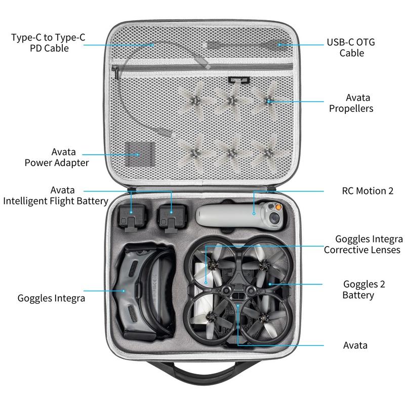 - Custom Design: Tailored specifically for the DJI Avata, this case features precise compartments to securely hold the drone, remote control, batteries, charging adapter, charger, goggles, and additional small accessories.