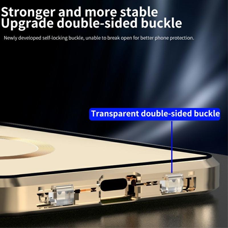 Dual-Sided Tempered Glass+Magnetic Metal Frame Anti-Drop Case for iPhone 15 Compatible with MagSafe Phone Cover with Buckle Lock - Dark Blue