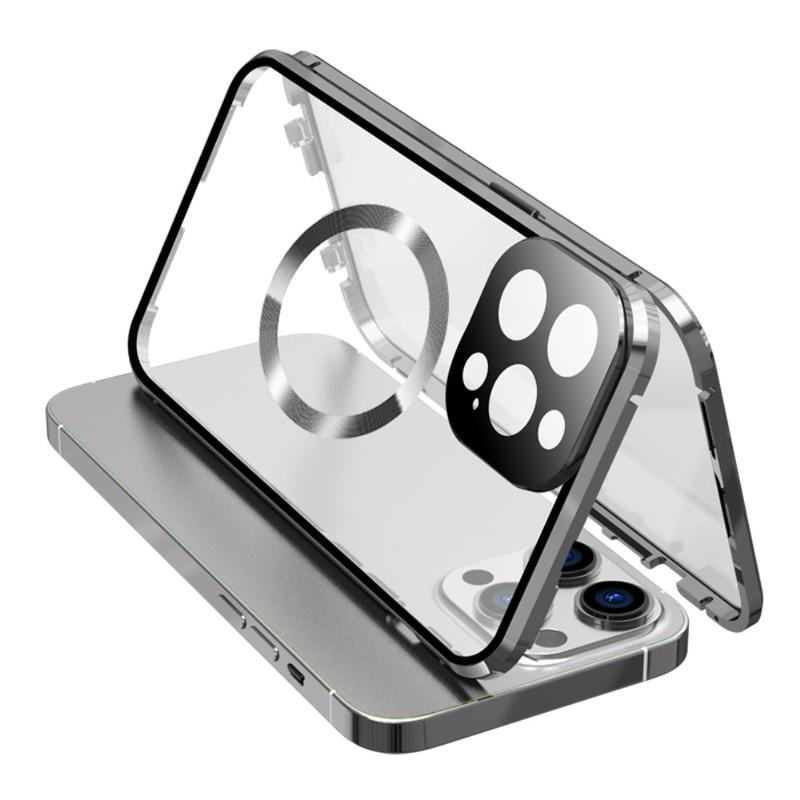 Dual-Sided Tempered Glass+Magnetic Metal Frame Anti-Drop Case for iPhone 15 Compatible with MagSafe Phone Cover with Buckle Lock - Silver