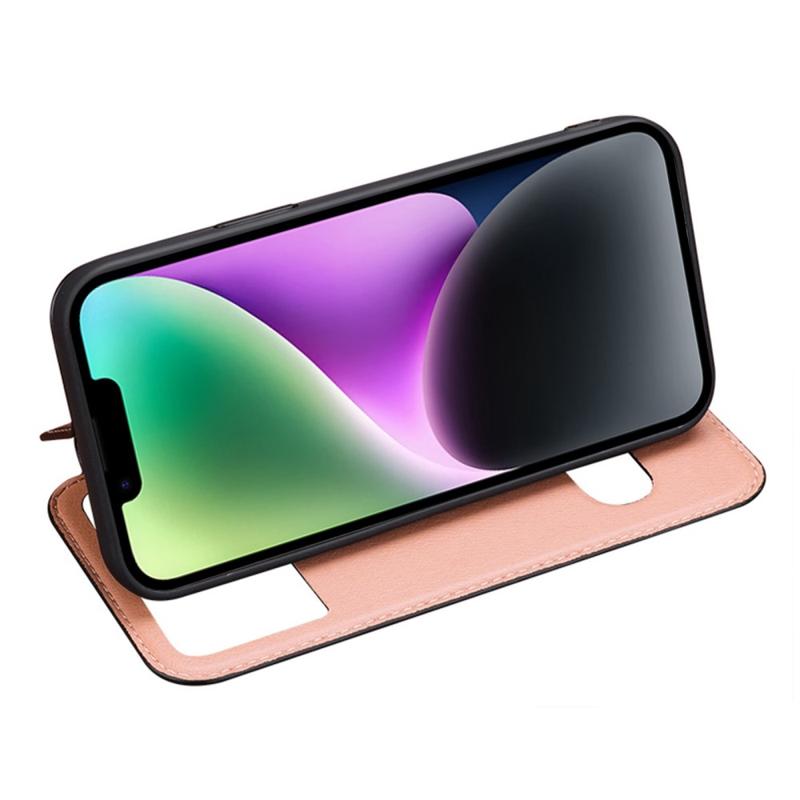 Shockproof Case for iPhone 14 Anti-Drop Phone Cover Dual Window Genuine Cowhide Leather Cell Phone Case with Stand