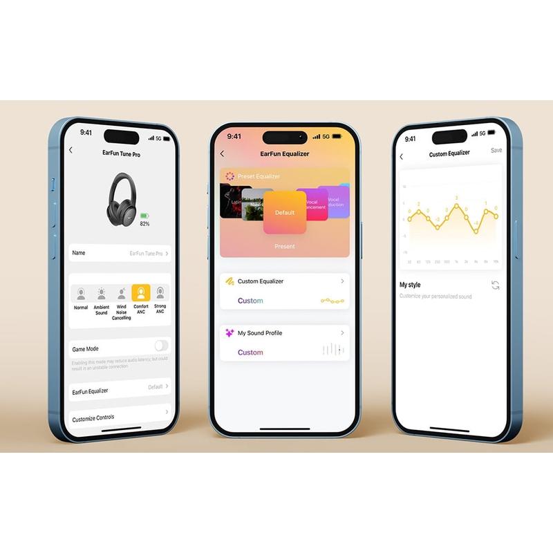 The Earfun Audio App allows you to customize the headphones' settings. You can choose from 30 Equalizer modes, change ANC modes, check charge levels and update software.