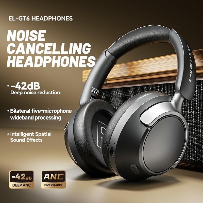 The EL-GT6 ANC noise cancelling wireless headphones delivers immersive audio and long-lasting comfort for gamers, music lovers, and professionals alike. Featuring advanced ANC 3.0 technology with adaptive noise reduction, it blocks out distractions and enhances your listening experience. Equipped with 40mm dynamic drivers and micro-crystal composite diaphragms, it produces deep bass, clear mids, and crisp highs for HiFi sound quality. With Bluetooth 6.0 connectivity, low latency, and up to 120 hours of playtime, this over-ear headset combines performance, comfort, and endurance in one premium package.