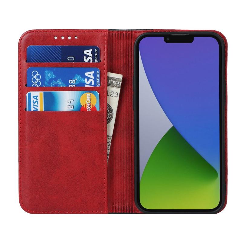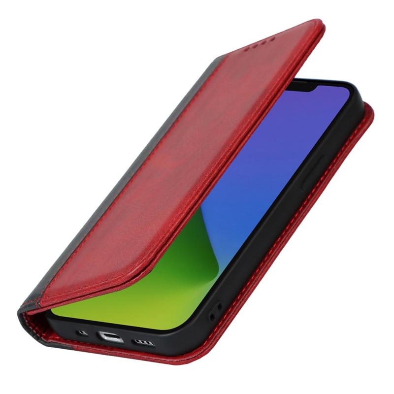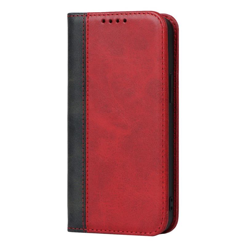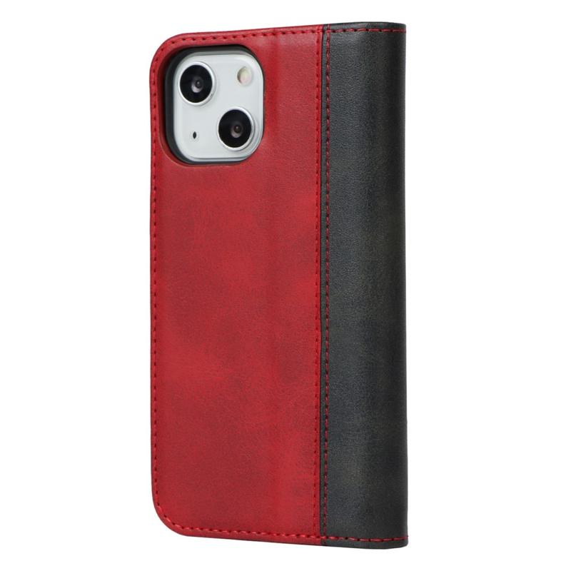 For iPhone 14 Bi-color Splicing Magnetic Auto-absorbed Calf Texture PU Leather Phone Case Drop-proof Wallet Stand Cover