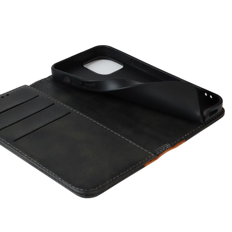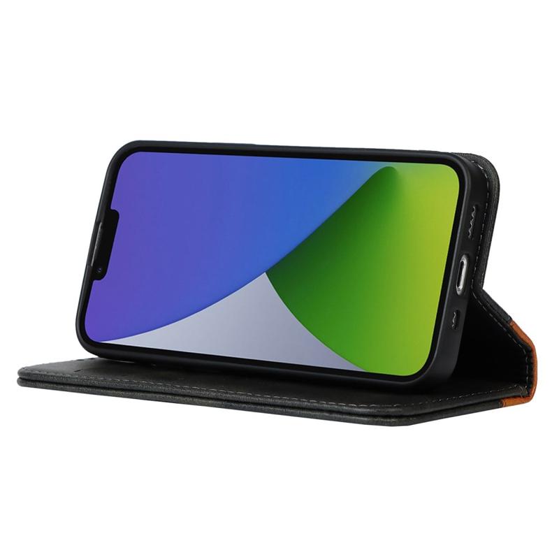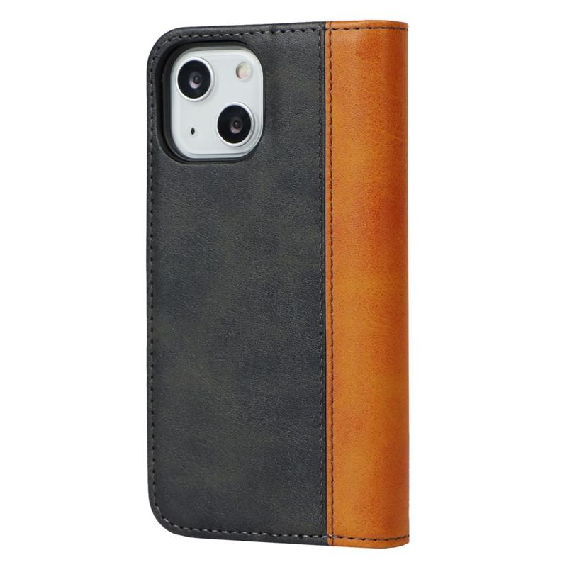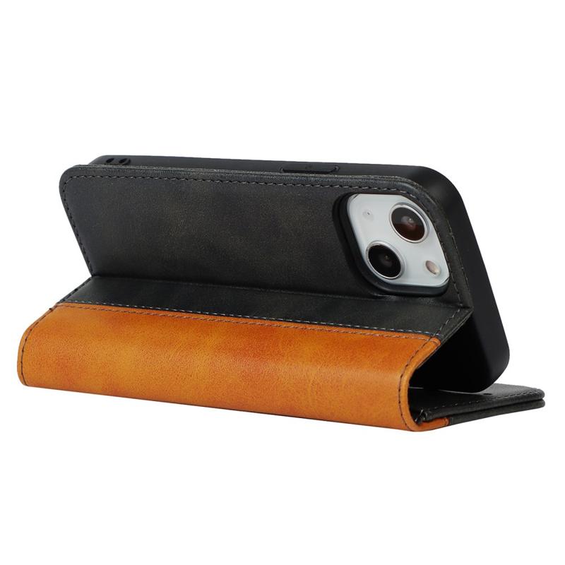 For iPhone 14 Bi-color Splicing Magnetic Auto-absorbed Calf Texture PU Leather Phone Case Drop-proof Wallet Stand Cover