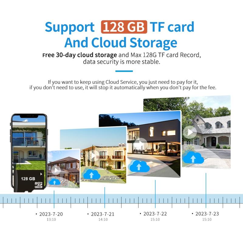 - Storage: Cloud storage + TF card up to 128 GB (not included)