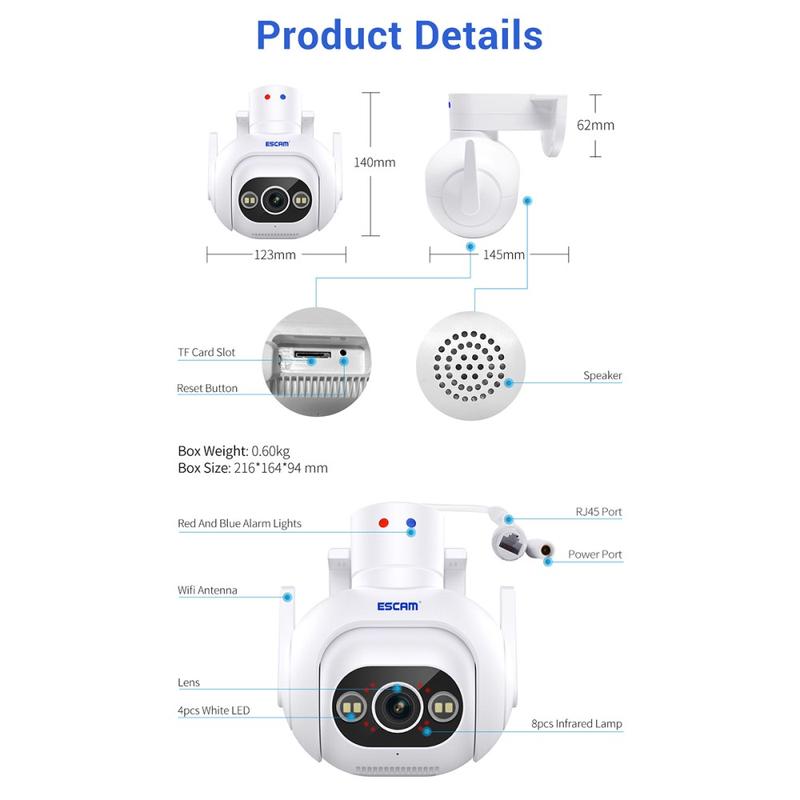 The ESCAM PT304 combines cutting-edge H.265 compression with advanced AI motion detection, making it perfect for both home and business security. The dual light source night vision and human tracking features give you the ultimate peace of mind, day or night. With a built-in alarm system, you can quickly react to any security threats, and with cloud storage or TF card options, you have flexible, secure recording options.