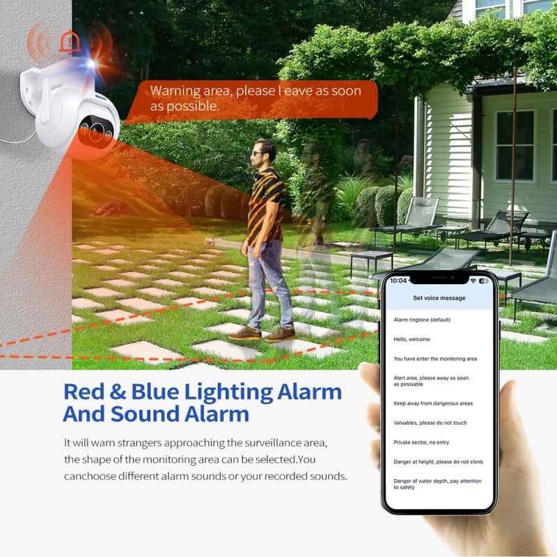 - Customizable Alarms - Set motion detection, humanoid detection, or alarm zones for tailored security. Supports red/blue light and sound alarms for instant notifications.