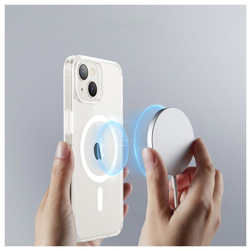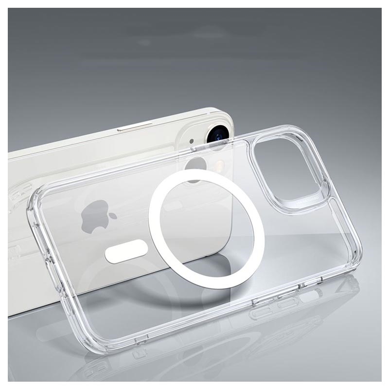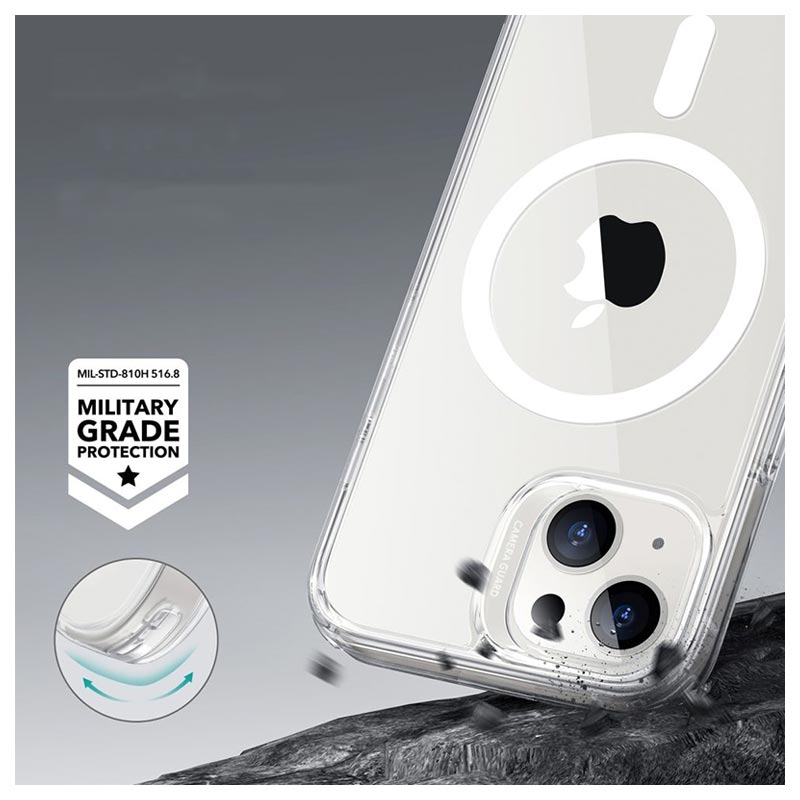 This ESR CH HaloLock Mag hybrid case shows off the original design of your iPhone 14 while giving it everyday needed protection against impacts, scratches, and dirt. It contains flexible sides, air-cushioned corners, and raised bezels on the camera lenses and display area. It also meets the military drop-test standard and contains a built-in magnetic ring on the back compatible with MagSafe holders, chargers, and other accessories that support MagSafe technology.