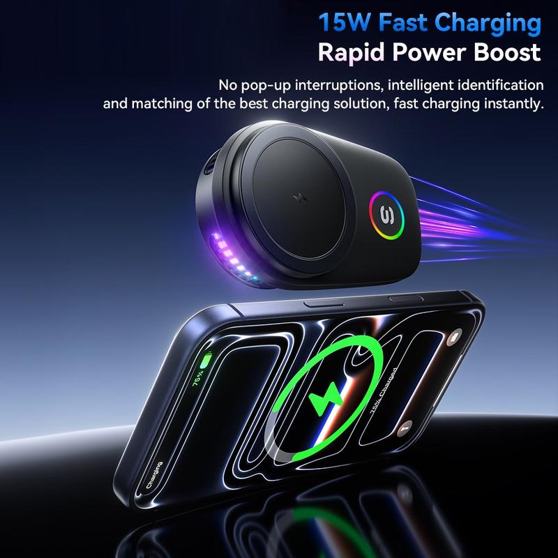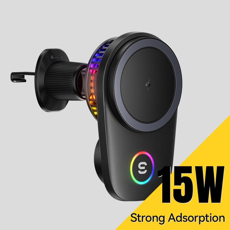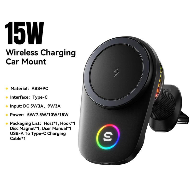Keep your phone charged, visible and firmly in place with the ESSAGER 15W magnetic wireless car charger. Designed for drivers who want a cleaner and more convenient setup, this air vent mount combines fast wireless charging, strong magnetic hold and active cooling in one compact accessory. The built-in RGB light adds a modern touch, while the 90 rotation makes it easy to switch between portrait and landscape view for navigation, calls or music control.