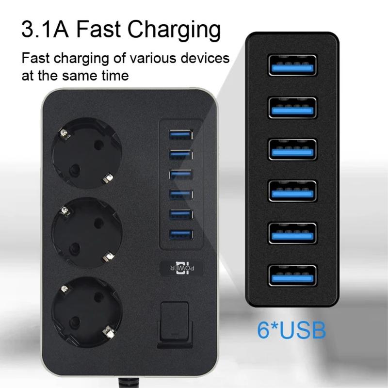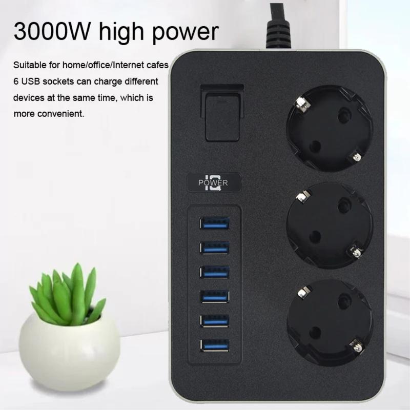 EU Plug 3000W High Power Strip 2m Extension Cable 3 AC Outlets with 6 USB Output Port (CE Certified)