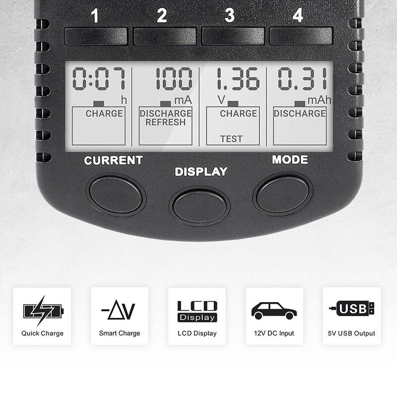 - Four operating modes: charge, discharge, refresh and a capacity test displayed in mAh