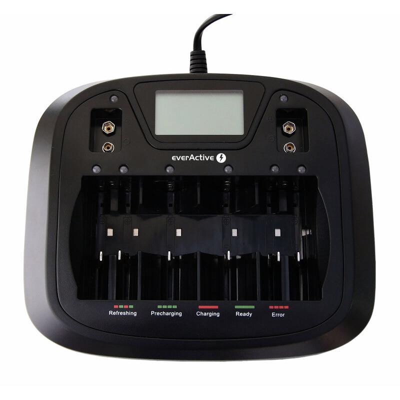 Fast, reliable, Versatile, CPU charger with LCD everActive NC-900U with USB socket. Features 8 fully independent smart charging channels with refresh/unload function. 6x R03 AAA, R6 AA interchangeable with 4x C R14, D R20 + 2 channels for 9V/6F22 cells, loads effortlessly single cells and odd, unusual battery configurations.