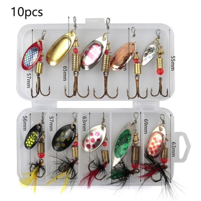 The fishing spinning set includes 10 high-quality metal lures designed to attract fish with their rotating sequin action and realistic bionic appearance. Compact and easy to carry, the set comes in a convenient storage box—perfect for anglers who want reliable gear on the go. Each lure is equipped with sharp triple hooks that improve catch efficiency and prevent fish from escaping easily.